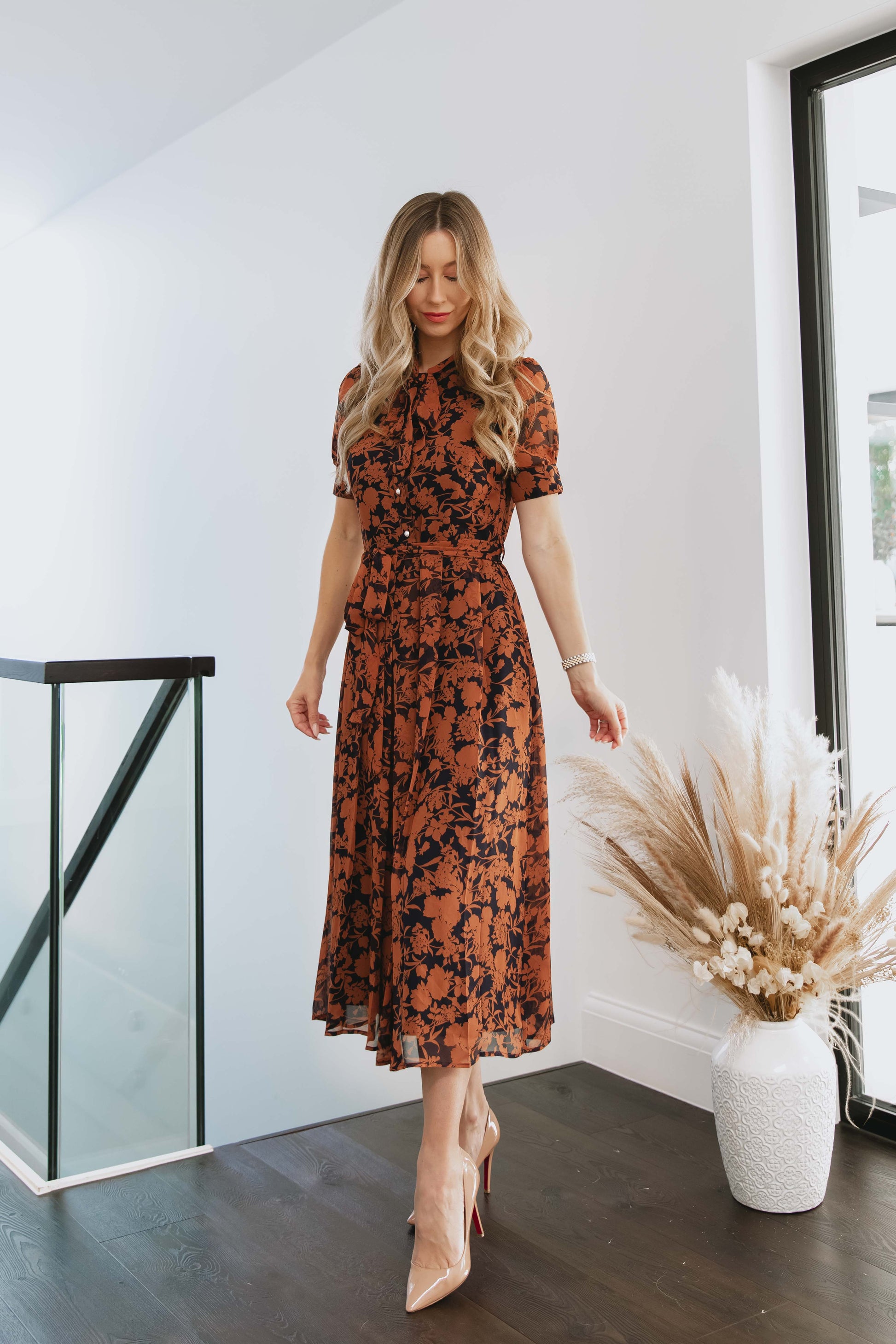 Feminine and classy, this midi dress is perfect for all seasons and can take you from work straight into the weekend. Featuring a zip at the side, pearl effect buttons running up the front, and a feminine necktie.